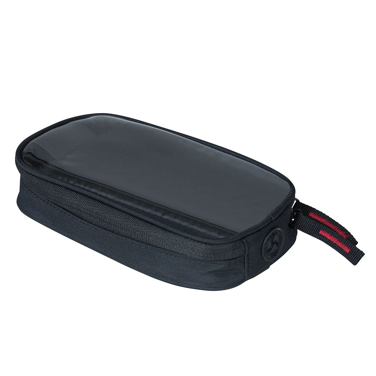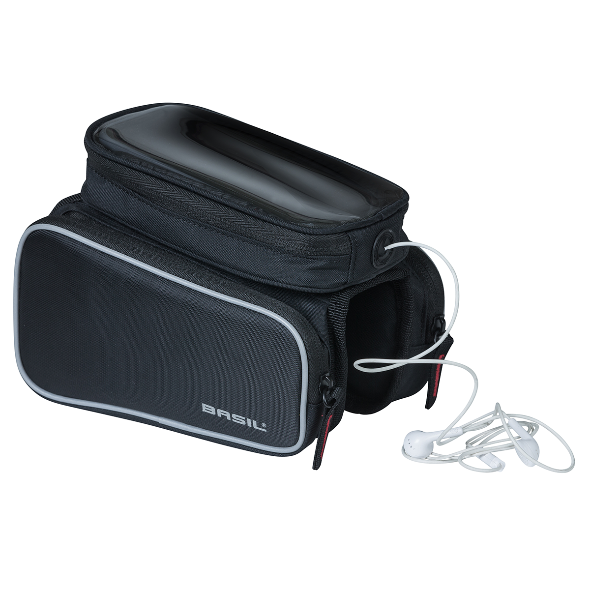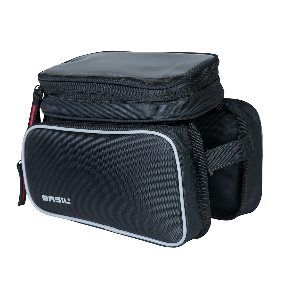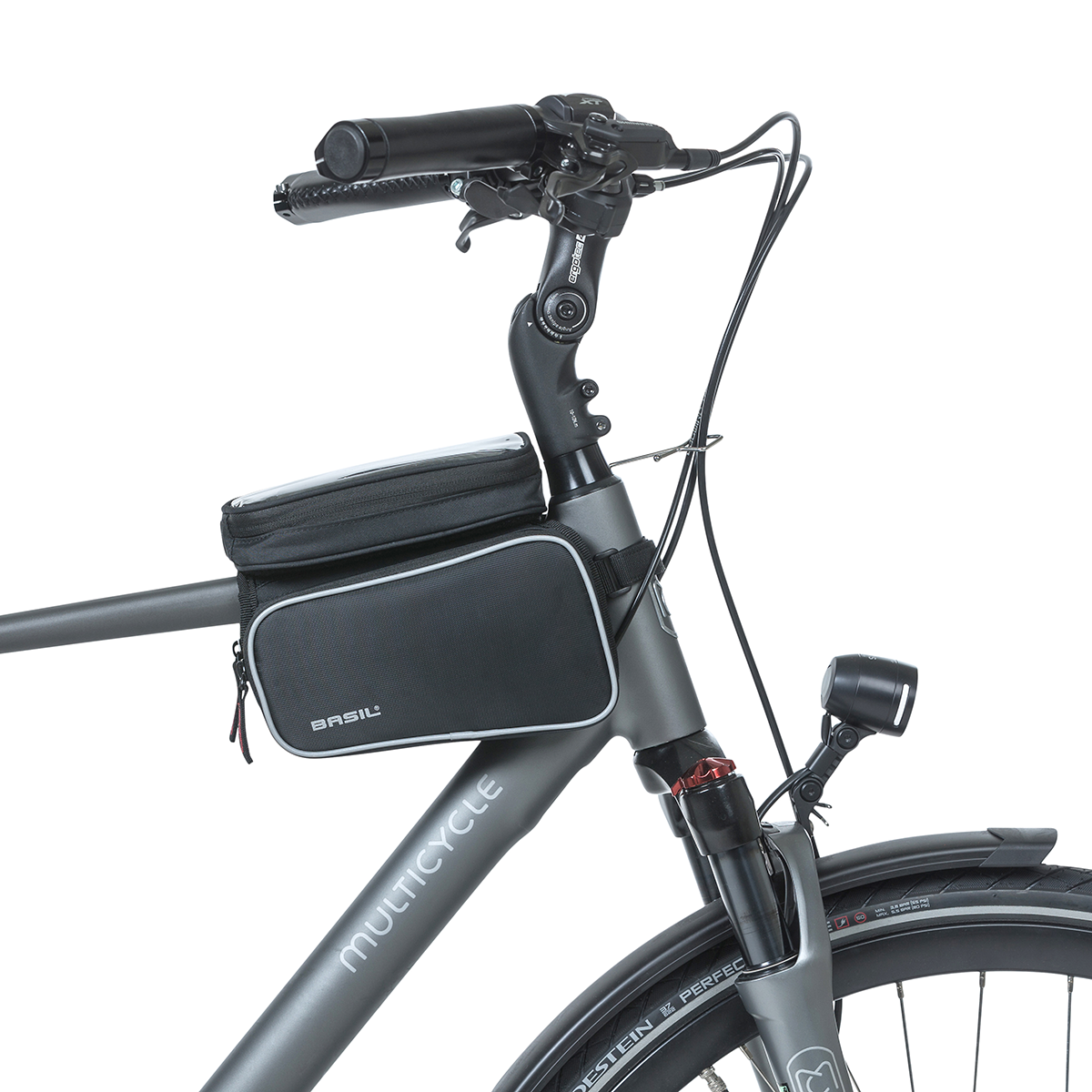 The SPORT DESIGN TOP TUBE FRAME BAG DOUBLE M by BASIL is a functional bicycle bag that can be attached to the top tube. A practical highlight is the removable touchscreen compatible pocket on top, where you can put your smartphone for navigation and remove it again with a flick of the wrist when stopping in a café.