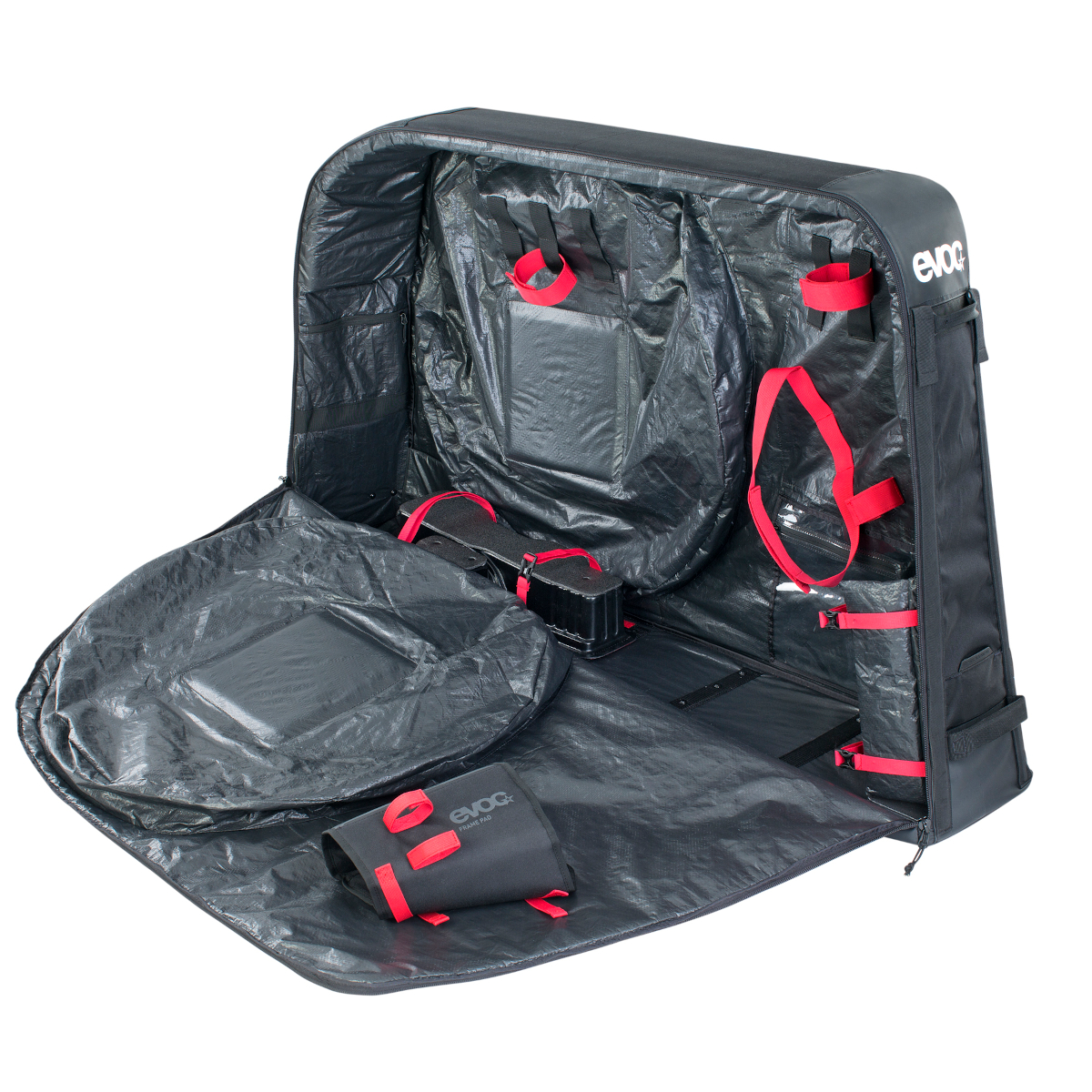 For many years, the BIKE BAG by EVOC has been a proven solution for transporting almost any type of bike. Especially when travelling by train or plane. Once your expensive bike is perfectly packed, you will definitely feel more comfortable when taking it with you on an airplane. Being a hybrid solution, the BIKE TRAVEL BAG combines the useful features of a hard protective case with those of a soft protective bag. The well-designed travel case with robust reinforcement pieces and padding perfectly protects your bike’s frame and components from pressure and damage.